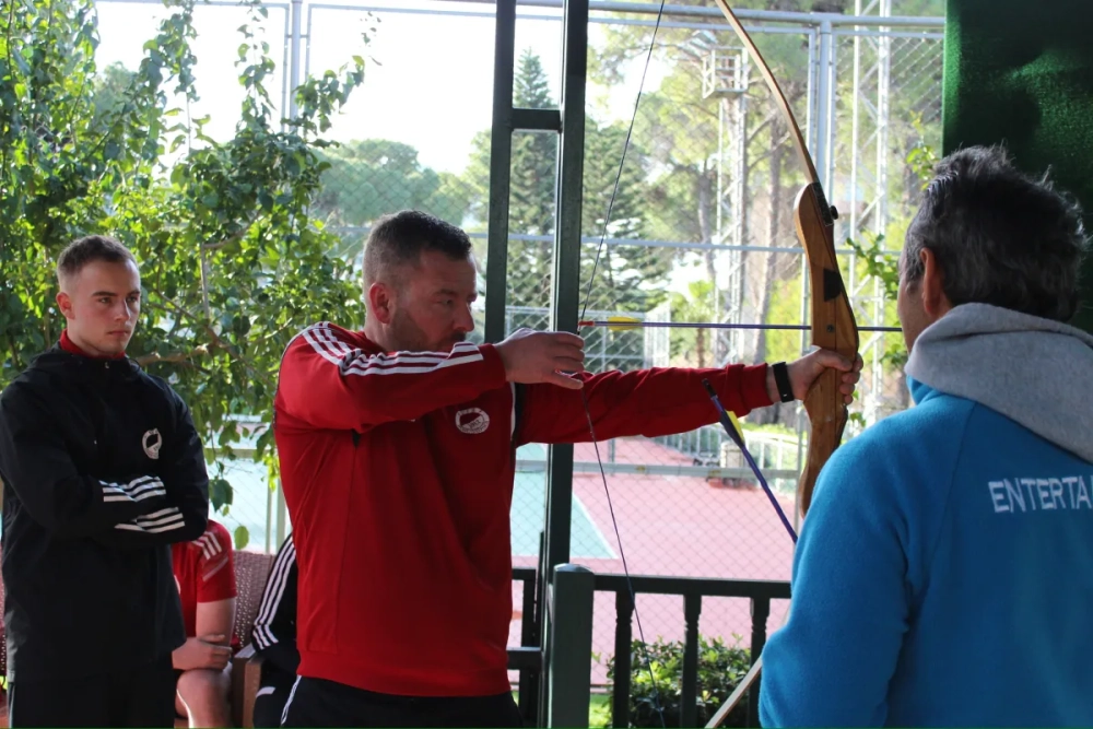 Nach der Einheit ging es geschlossen mit dem Bus zurück zur Hotelanlage. Beim anschließenden Bogenschießen wurden erneut Zimmerpunkte vergeben. Um 12:00 Uhr folgte das gemeinsame Mittagessen, bevor um 13:15 Uhr die Abfahrt nach Side zum Testspiel anstand.